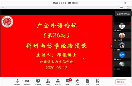 2020年5月13日下午公司邓薇博士做了一场在线“科研与访学经验漫谈”的云讲座,威廉williamhill体育有近一半的专任教师参加了此次讲座。