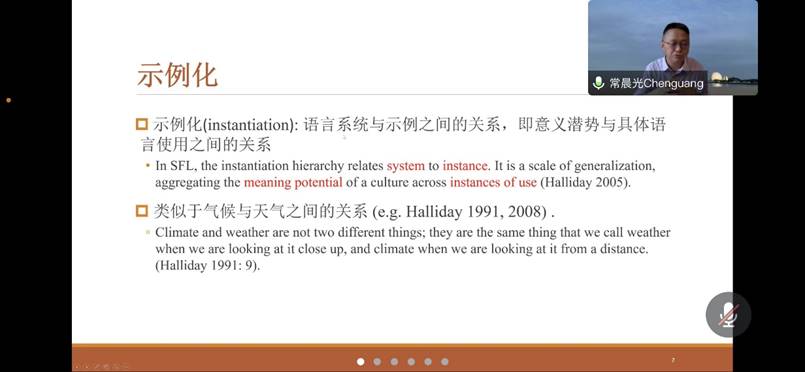 常教授主要从系统功能语言学理论视域系统介绍了“再示例化”、“语义投入”和“翻译中的对等”研究成果和思考。常教授首先解释了“示例化”这一概念,