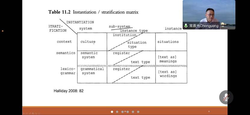 指出它是指语言系统与示例之间的关系,即意义潜势与具体语言使用之间的关系,还通过天气与气候之间的关系形象地解释了示例与语言系统之间的关系。常教授以2018年在核心期刊perspective发表的论文为例,和老师们分享了对《傲慢与偏见》不同版本的译文研究,从语言概念意义、人际意义和语篇意义的角度探讨了不同版本的语义投入度情况。