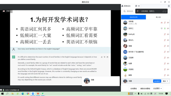 刘传江博士分享了其在学术英语词表研究方面的研究成果,并以《西南联大英文课》中的课文为例,在线演示了学术英语词表的应用。刘博士指出:学术英语词表的应用对教师在英语教学过程中分析文本的难度,确定教学目标,开发词汇测试和对教材课文进行科学排序方面都具有重要指导意义。