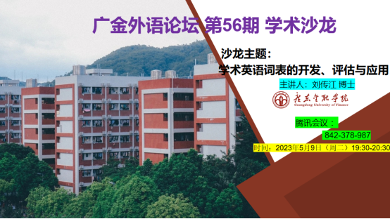 2023年5月9日星期二晚上,威廉希尔第56期广金外语论坛在线上以腾讯会议的方式举行。此次外语论坛的主题是:“学术英语词表的开发、评估与应用”。论坛邀请了公司大学英语一部主任刘传江博士为公司教师介绍有关学术英语词表的研究和应用。