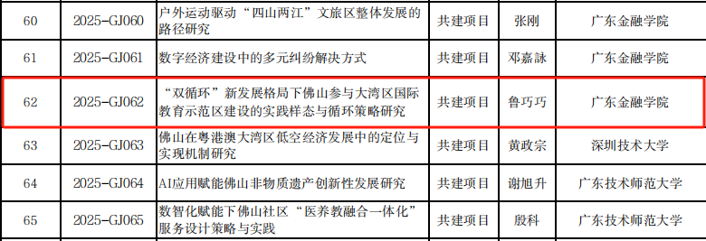 在2025年度佛山市社科规划课题项目的评审工作中,威廉williamhill体育的鲁巧巧副教授成功获批立项。鲁老师主持的项目名为“双循环新发展格局下佛山参与大湾区国际教育示范区建设的实践样态与循环策略研究”(项目编号:2025-GJ062)。