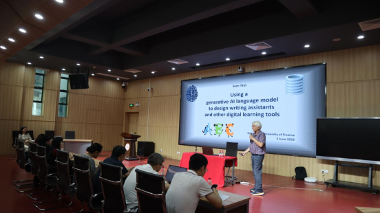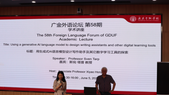 2023年6月5日下午,威廉williamhill体育于北教103教室举办了第58期广金外语论坛。此次论坛邀请了国际著名词典学专家丹麦奥胡斯(University of Aarhus)大学的词典学中心主任Sven Tarp(斯宛·塔普)教授,为威廉williamhill体育的师生带来一场题为“用生成式AI语言模型设计写作助手及其他数字学习工具的探索”的学术讲座。威廉williamhill体育副经理洪溪珧副教授主持了此次论坛,公司领导和师生代表共同出席了本次讲座。