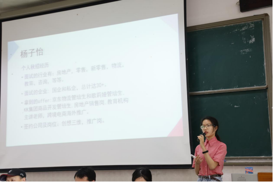 接着,2017级商务英语1班杨子怡同学从个人经历、面试准备以及校园招聘重要性三个方面做了就业经验分享。她建议要用数据描述简历,注意完善线上简历;详细了解相关行业和公司信息,熟悉岗位的工作内容;面试时用三个关键词法来介绍自己,学会总结与复盘。校园招聘具有匹配度高,简历免筛选,省时省力等优势,建议大家多参加校园招聘。