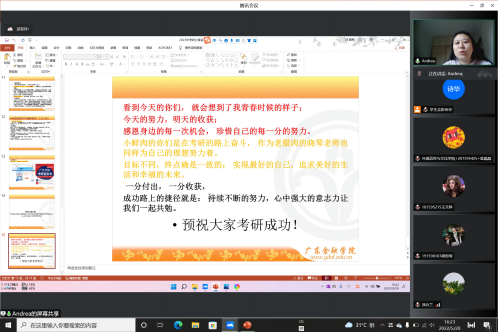 在分享会的最后,涂兵兰副经理发表闭幕致辞,表达了对境内外考研上岸的同学们的祝贺,同时也告诉同学们一定要对自己的专业有信心,对自己的学业有信心,要认识到努力才能获得选择的权利,经受得住寂寞,忍受得了痛苦,合理规划,才能考研上岸!