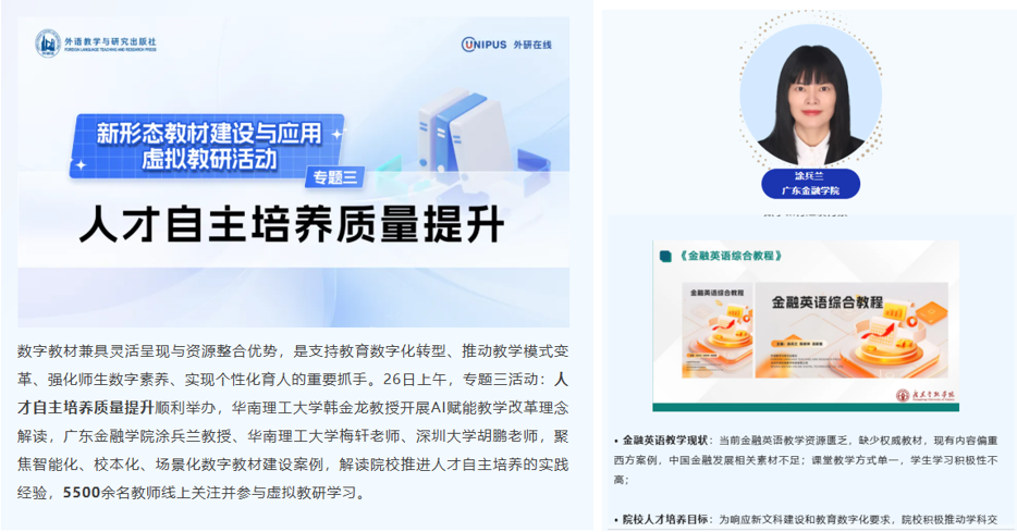 经理涂兵兰教授作为数字化战略推手,受邀分享经验。2025年4月,她在外研在线虚拟教研活动中分享《金融英语综合教程》创新经验,吸引5500余名教师在线参与。她指出,数字教材通过整合文字、音频、视频等多模态资源,首次构建了立足中国金融实践的立体化教学体系。数字化改革使得教师从"焦虑"走向"优化",员工突破时空限制,自主学习能力提升30%。通过互动写作任务设计,员工金融术语应用能力显著增强。